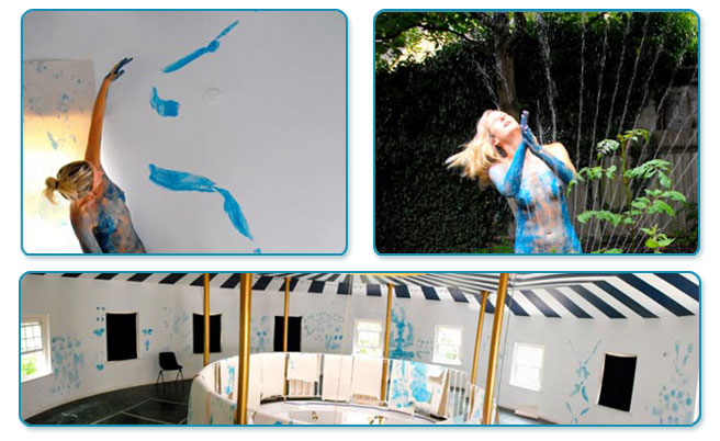 “Familiar outlines; a breast, a thigh blending into palms and lips created these strange blue shadows in which you are challenged to take in several angles of a body at once. You began to envision the performer as a ghost traced by their marks on the wall, as you try to decipher the choreography their body must have endeavoured to create its print. Where the performer leant, where they balanced, how they must have contorted themselves to place "that footprint up there". The prints become much more than an image of the body, but in themselves reveal the cartography of a body in space, in which is contained the subtle narrative their creation, each as individual as their creator.”