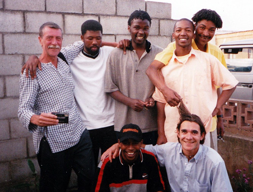 Xolani with Noel Greig (far left) Zwai Mjima (centre) Jean Pagni (kneeling right) in New Brighton 1999.